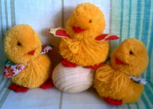 Пасхальные утята изготовлены их акриловой пряжи по типу изготовления помпонов, с использованием х\б ткани и бисера